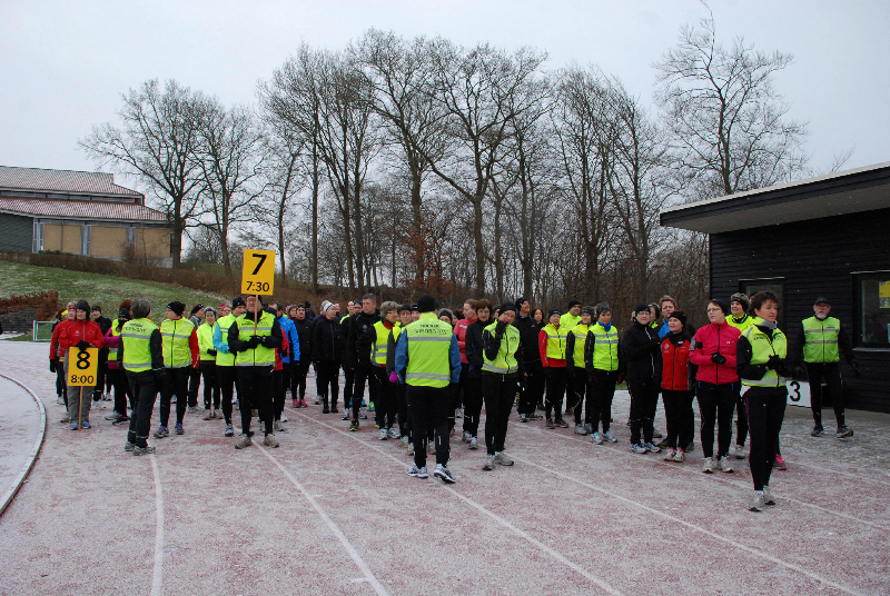 Løbetræningen startede i dag med 195 deltagere fordelt på 8 tempogrupper der løb turen rundt om Søndersø. Flot løbevejr med frost og et meget tyndt lag sne.